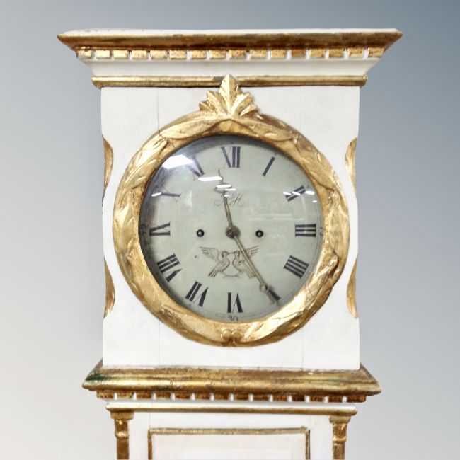 A Danish painted and gilt longcase clock with circular dial, pendulum and weights.