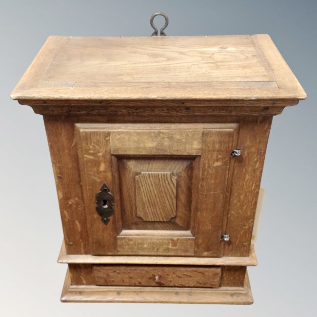 A 19th century oak panel door hanging wall cabinet, fitted drawer beneath.
