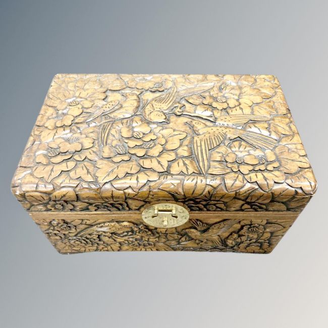 A carved wooden jewellery box with bird decoration, width 30 cm.