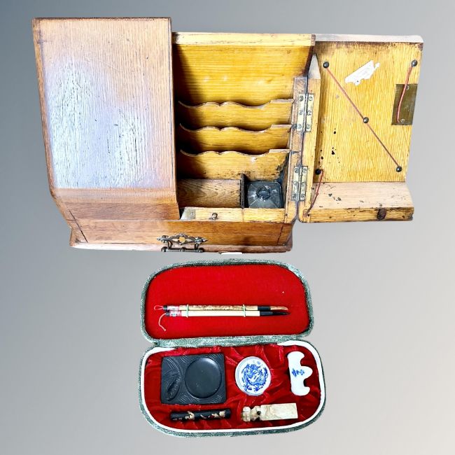 A Victorian oak correspondence box and a Japanese caligraphy set (2)