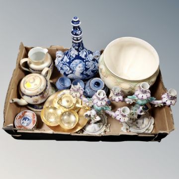 A box containing assorted antique and later ceramics, Japanese tea ware, continental figural candlesticks, gold plated teaware.
