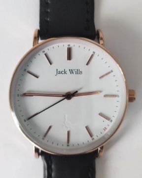 A Jack Wills watch JW018FLWH on black leather watch strap, new with film. Alloy case water resistant to 30m.