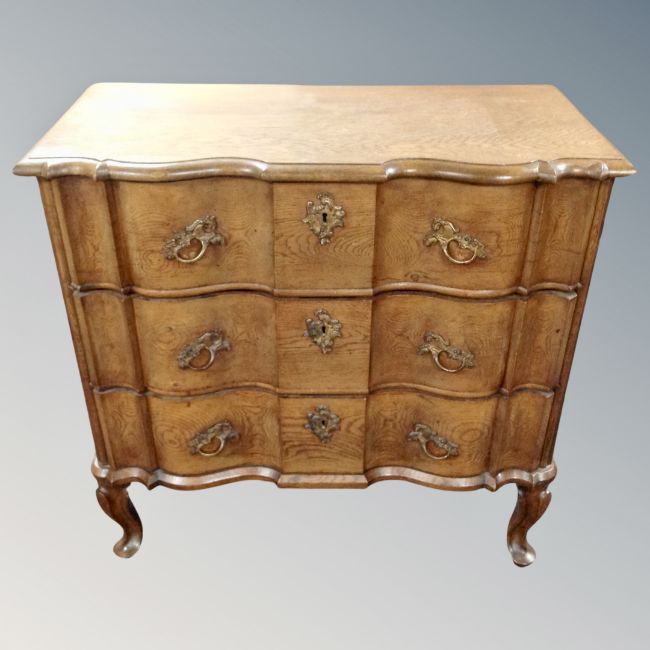 A 19th century oak serpentine front three drawer chest on raised legs, 87cm by 45cm by 85cm