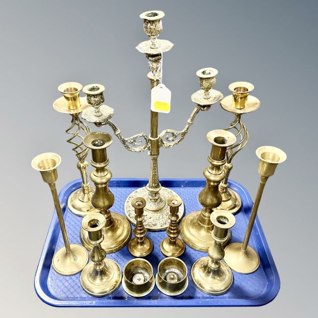 A tray containing six pairs of antique and later brass candlesticks together with a further three-way candelabrum.