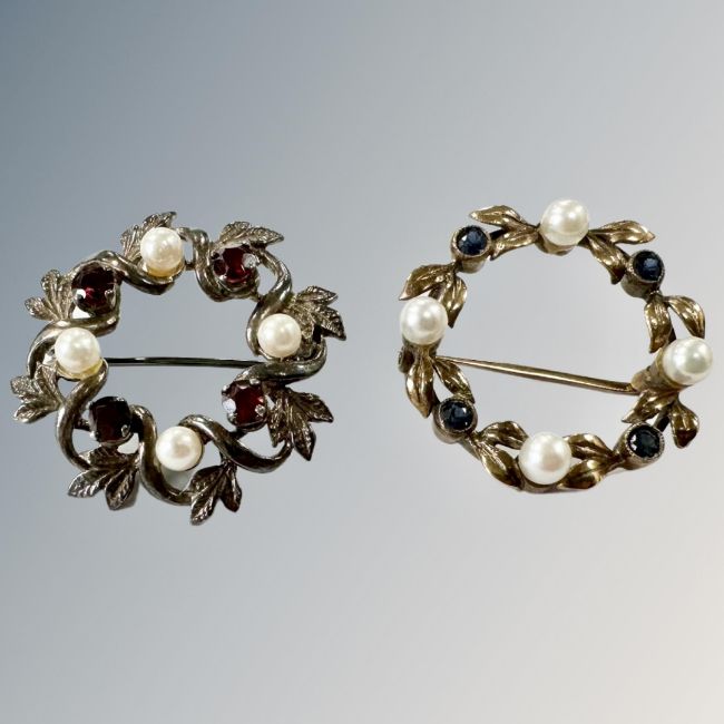 A 9ct gold sapphire and pearl bar brooch, together with a further similar brooch in silver. (2)