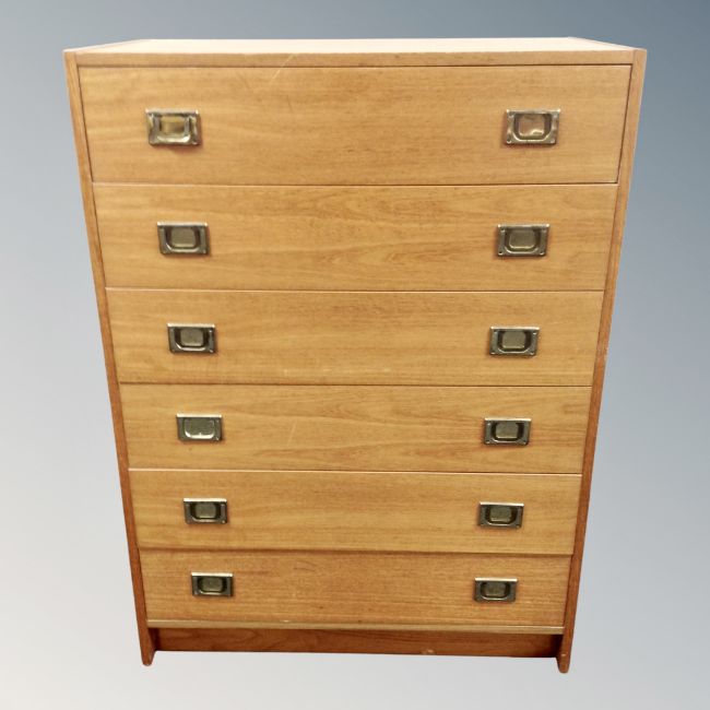 A mid 20th century Scandinavian six drawer campaign style chest with brass drop handles, 75cm by 41cm by 102cm
