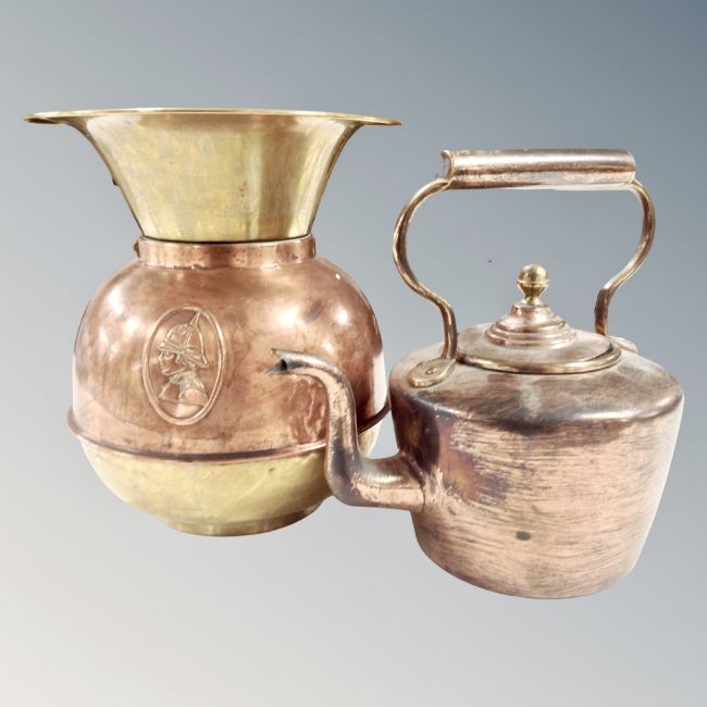 A 19th century copper and brass spitoon and a further copper kettle