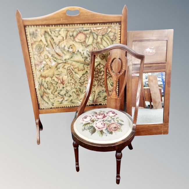 An Edwardian mahogany leather upholstered fire screen together with a beechwood nursing chair and mahogany wall mirror