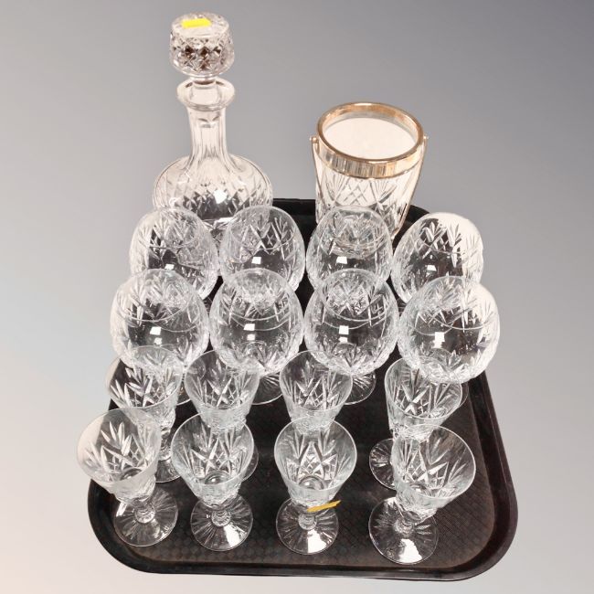 A tray of eight lead crystal brandy and liqueur glasses, further decanter and ice bucket