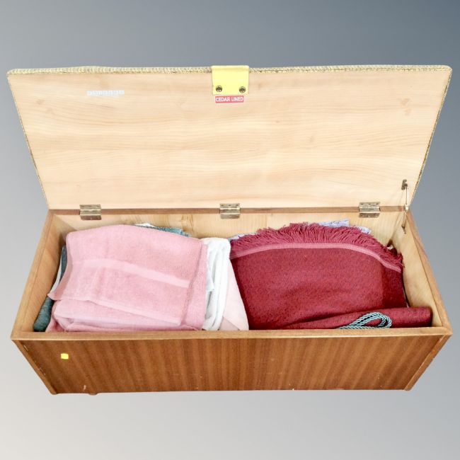 A 20th century Umifilex cedar lined blanket chest containing towels, stitched quilts, bed throw