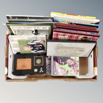A box containing Newcastle United memorabilia, photograph books, Newspaper cuttings, annuals to include The Dandy, Oor Wullie