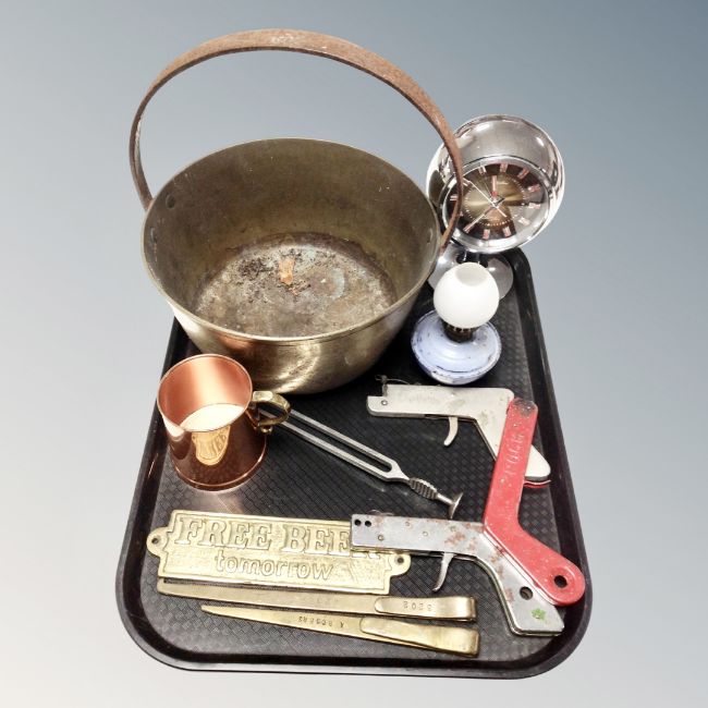 A tray of vintage brass cast iron jam pan, Japanese alarm clock, miniature enamelled oil lamp with shade, tuning fork