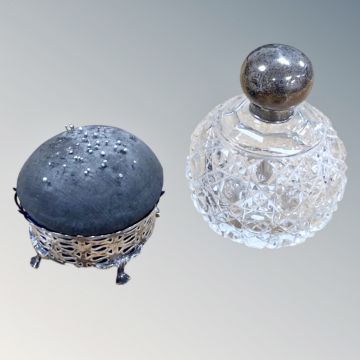 A silver topped cut crystal scent bottle, Chester 1922, together with a silver pin cushion Birmingham 1910. (2)