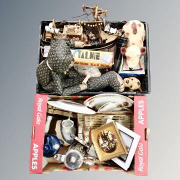 Two crates of wooden fishing trawler, soft toys, Mag-lite plated wares, Royal Albert Old Country Roses china