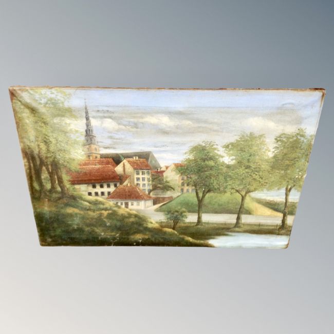 Continental School : Buildings by trees, oil on canvas, un-framed, 108 cm x 70 cm
