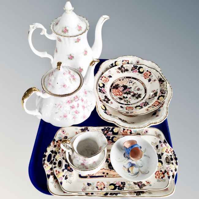 A tray of assorted ceramics, Masons plates and dishes, paragon Victoria rose tea pot, sugar basin, Royal Albert Forget me not tea pot