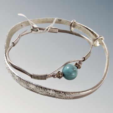 A small white metal bangle with turquoise bead together with a large adjustable sterling silver bangle.