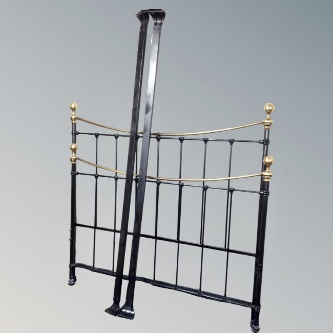 A Victorian style black metal and brass 4'6 bed frame