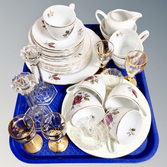 A tray of czech and other tea china, pair of glass candlesticks, four gilt glass sherry glasses