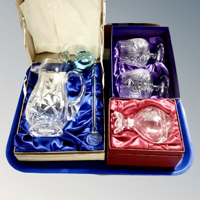A tray of Stuart Crystal jug with Stirrur, Edinburgh crystal glasses, Newcastle upon Tyne Perfume bottle, all boxed, further glass snail ornament