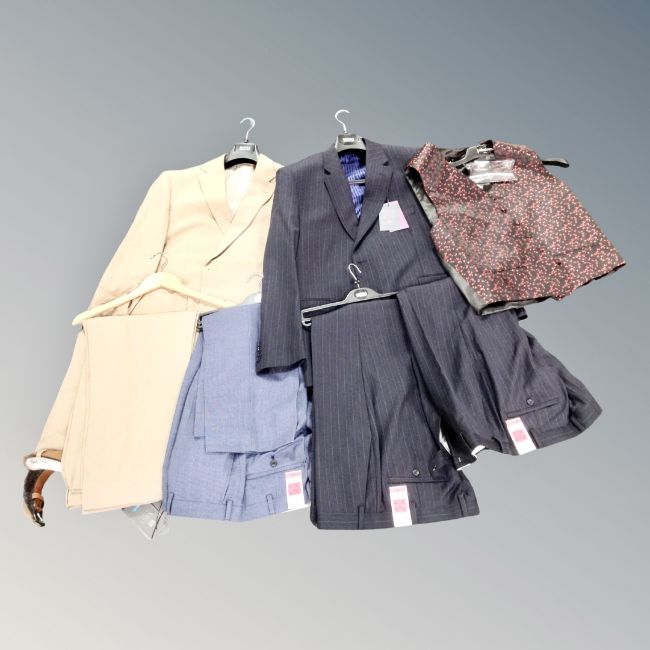 An M & S linen blend two piece suit, together with a further M & S regular luxury two piece suit, two pairs of M & S trousers and Slaters waist coat, mostly all tagged.