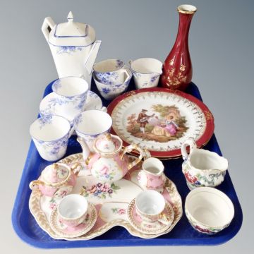 A tray of assorted ceramics : eight piece miniature tea service, Booths Flora Dora milk jug and sugar basin, Limoges part Wellington china Art Deco tea service