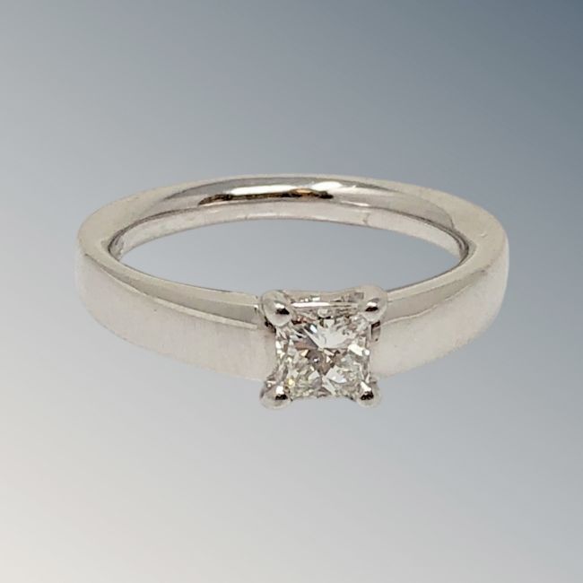 An 18ct white gold princess cut solitaire diamond ring, approximately 0.5 carat, size M