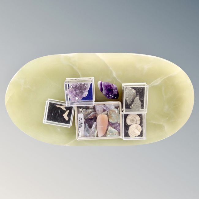 A shallow marble dish containing a small quantity of semi-precious gem stones, fossils, fossil shark's teeth