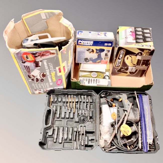 An Earlex Combi steamer kit together with a box containing hammer drill, Powercraft drill, soldering kit and sprayer