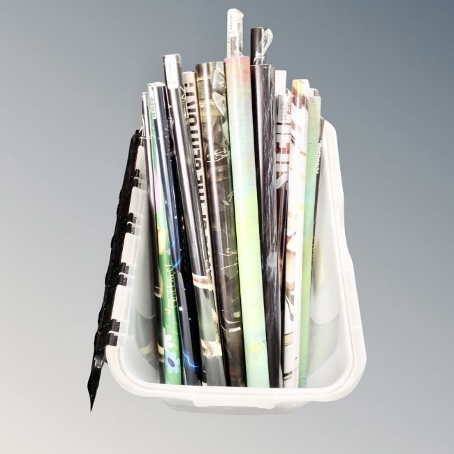 A storage crate of rolled posters