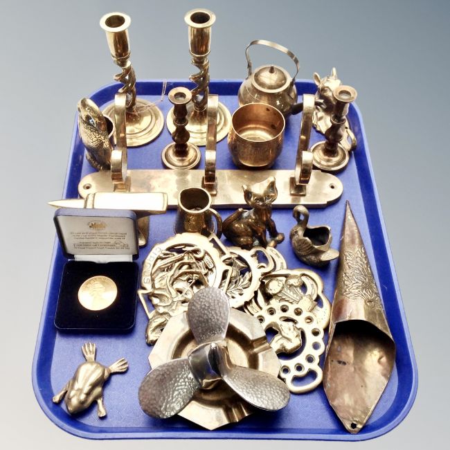 A tray of assorted antique and later brass wares : horse brasses, candlesticks, coat hooks, ashtray, a chrome and metal propeller, 22ct gold plated The Tower Mint medal