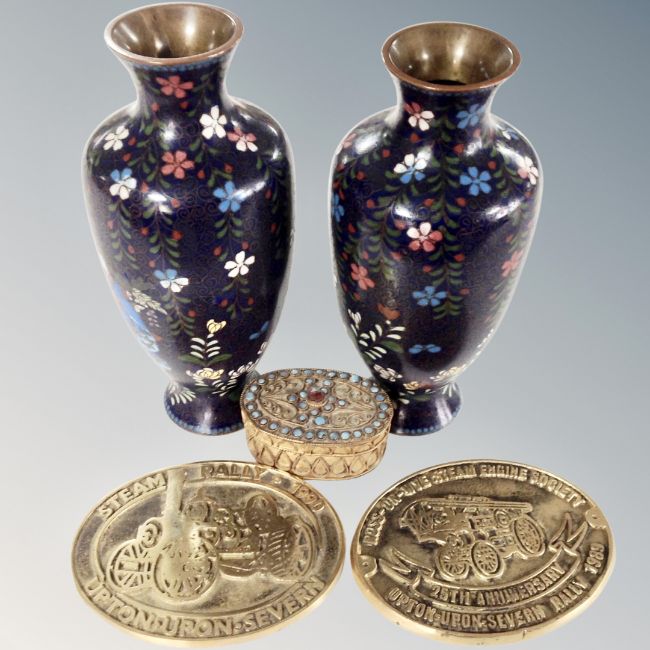 A pair of Japanese cliosonne vases, gilt metal lidded trinket box and two brass steam railway plaques