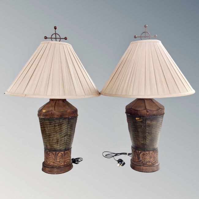 A pair of contemporary metal table lamps with silk shades