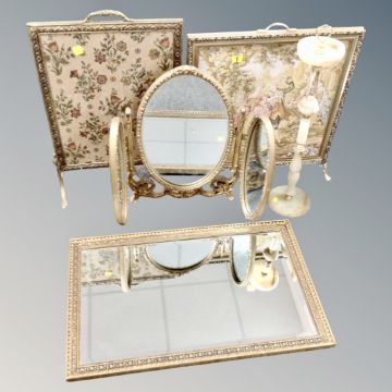 An onyx smoker's stand together with gilt framed mirror, gilt triple mirror and two tapestry fire screens