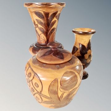 A carved wooden vase, height 27 cm, together with a further vase height 18 cm and lidded biscuit barrel.