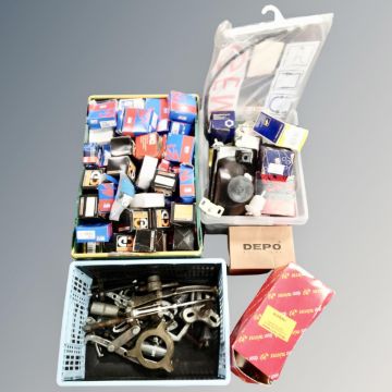 Three crates of car parts including head lights, wing mirrors, track rod ends, cooling caps, etc, mostly boxed and new
