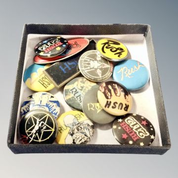 A collection of fourteen rare Rush pin badges, silver 2112 star pendant on chain