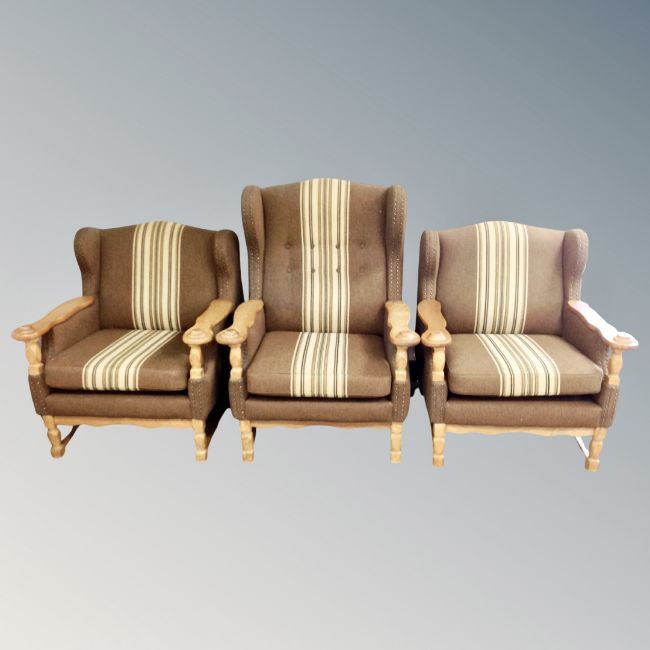 A pair of 20th century Danish blond oak lounge chairs in brown striped fabric together with matching armchair (3)
