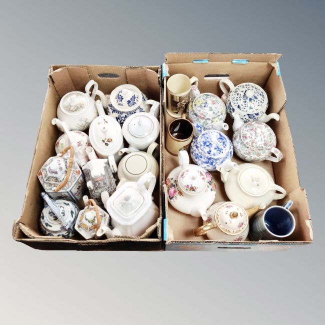 Two boxes of ceramics tea pots and tankards