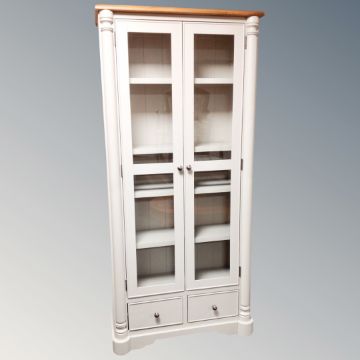 A contemporary double door glazed bookcase fitted with drawers beneath with oak top