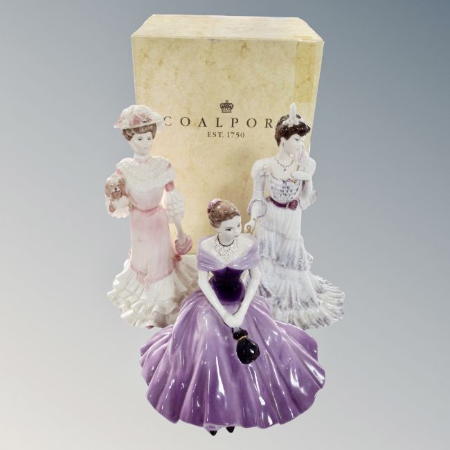 Three Coalport figures, Lady's of Fashion, Patricia, boxed Golden Age Eugenie First Night at the Opera Edition Number 6053 or 12500 and Golden Age Georgina Issue Number 8528 or 12500