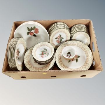 Two boxes of Johnson brothers dinner ware, wall plates, Spode plates, Spode oversize tea cup and saucer, Wedgwood jugs, 70's table lamp etc