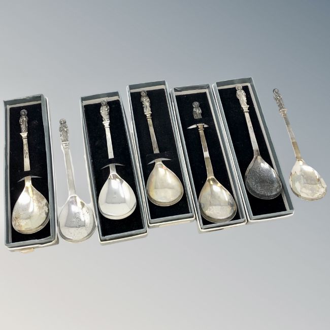 A collection of seven silver apostle spoons each showing a different saint (five boxed)