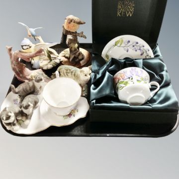 A tray of Royal Botanic Kew tea cup and saucer in presentation box, further Queen Ann bone china cup and sandwich plate, Leonardo and Border Fine Arts animal figures