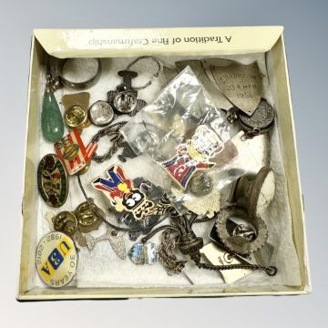 A 9ct gold earring, further baby brooch, silver charm bracelet with enamelled fobs, further loose silver fobs and charms and a silver bracelet. Together with a further box of trinkets and badges. (Qty)