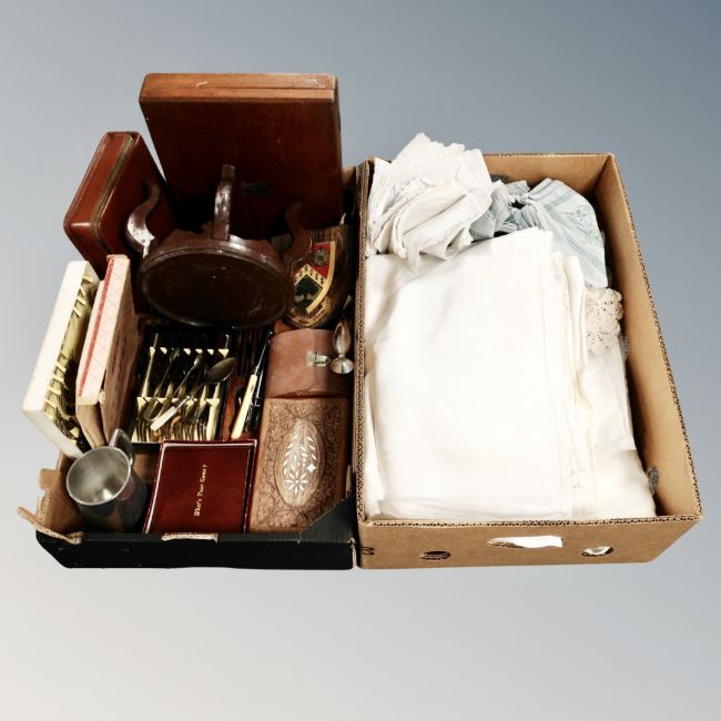 Two boxes of antique mahogany canteen, cased cutlery, table boxes, Gent's travel set, linen etc