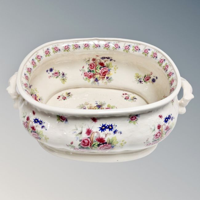 A cream floral wash jug and basin together with further twin handled foot bath