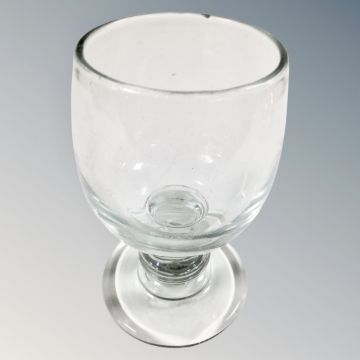 A hand made mouth blown cupped bowl rummer with knopped squat stem