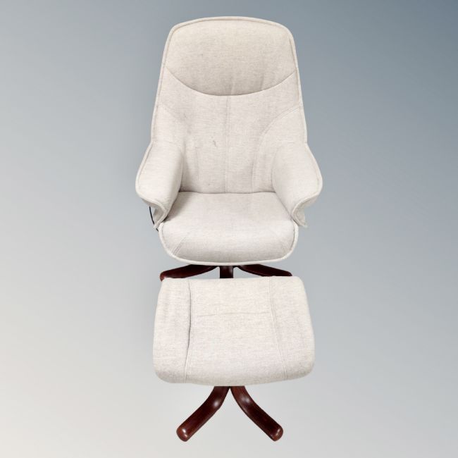A swivel relaxer adjustable armchair with foot stool upholstered in a grey fabric.