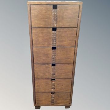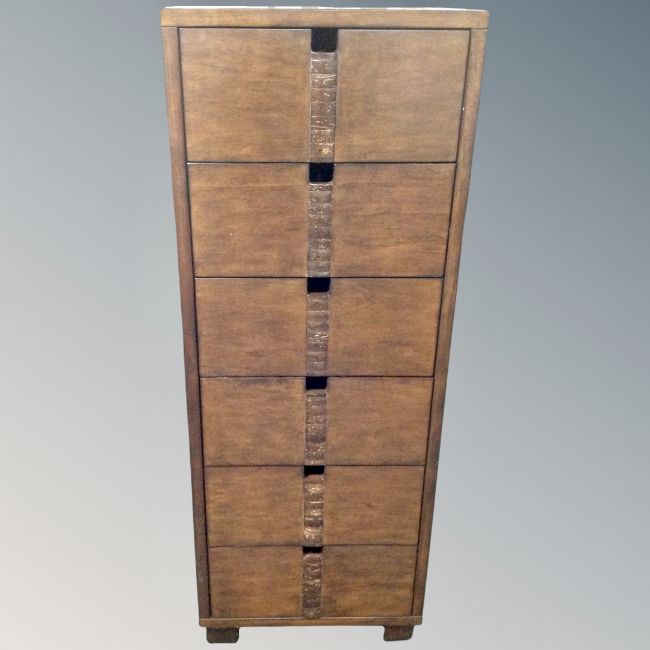 A narrow six drawer chest in an antique finish, 128cm high by 48cm deep by 42cm high.